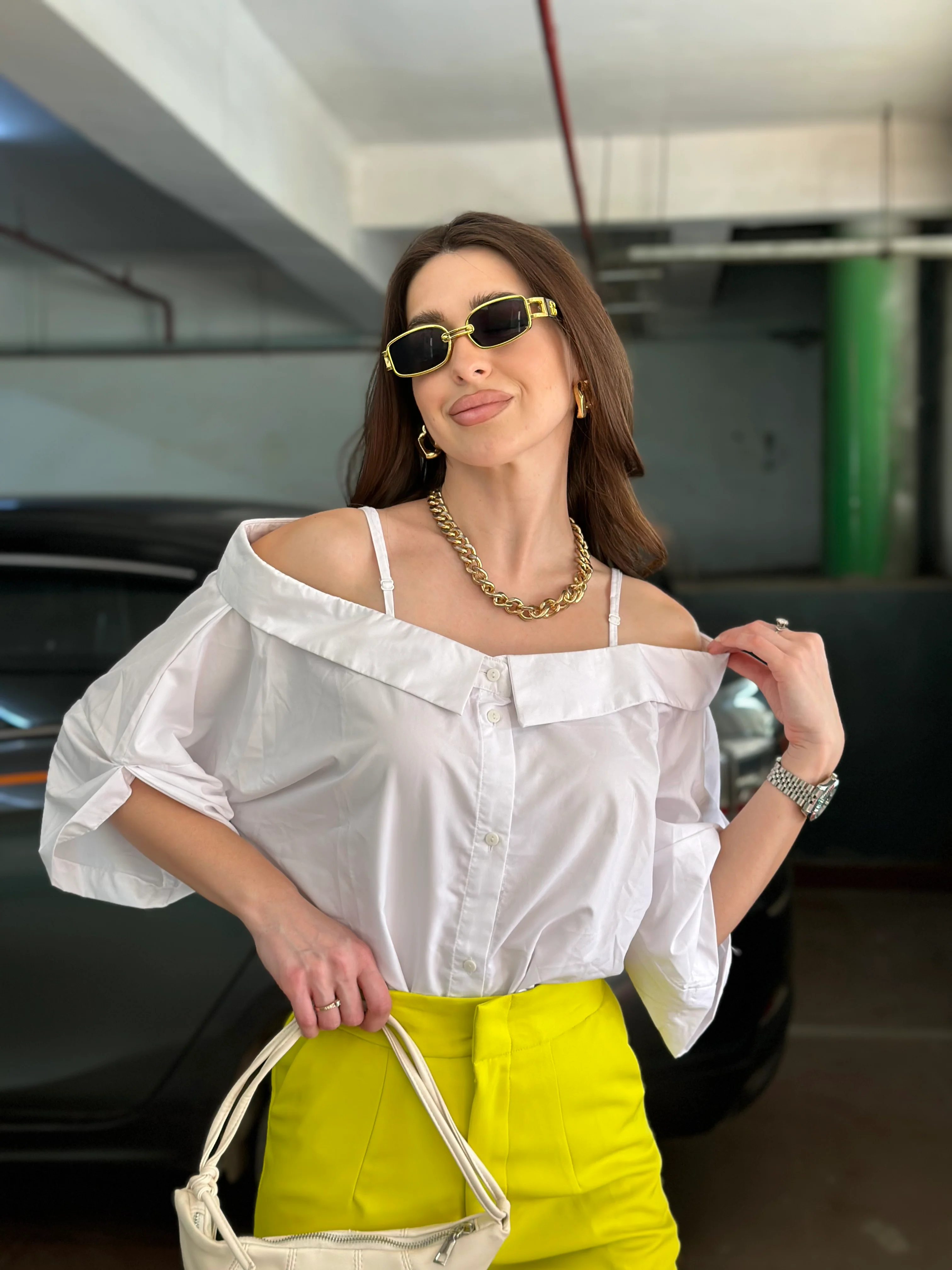 - Details: Off-Shoulder, Button Down, Adjustable Straps, Collar